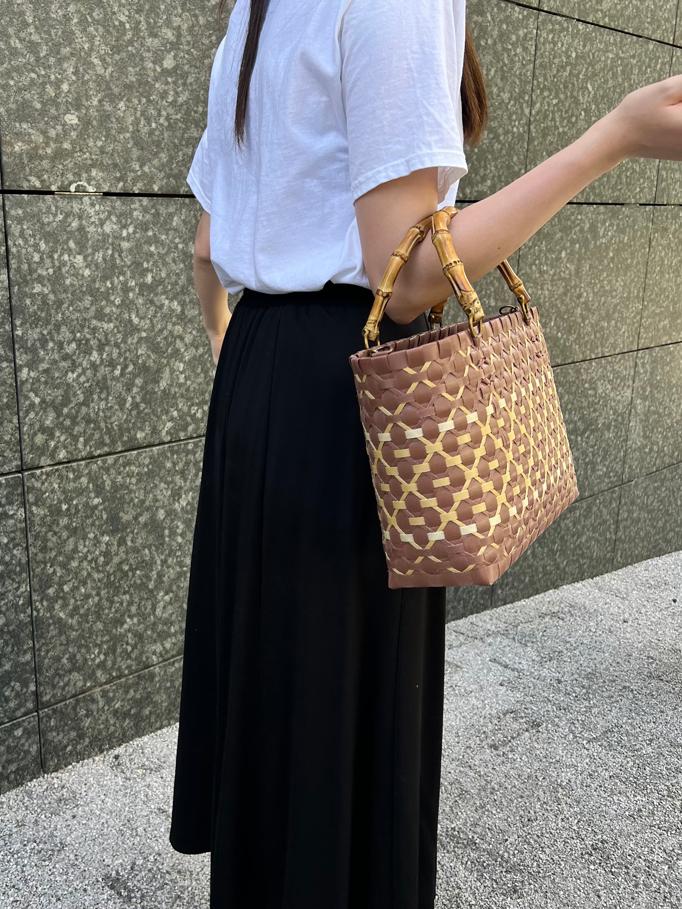 プラカゴ Sサイズ/B5 S-332 こげ茶*ベージュ 2way バンブーハンドル プラカゴバッグ 雨の日バッグ PPバンド
