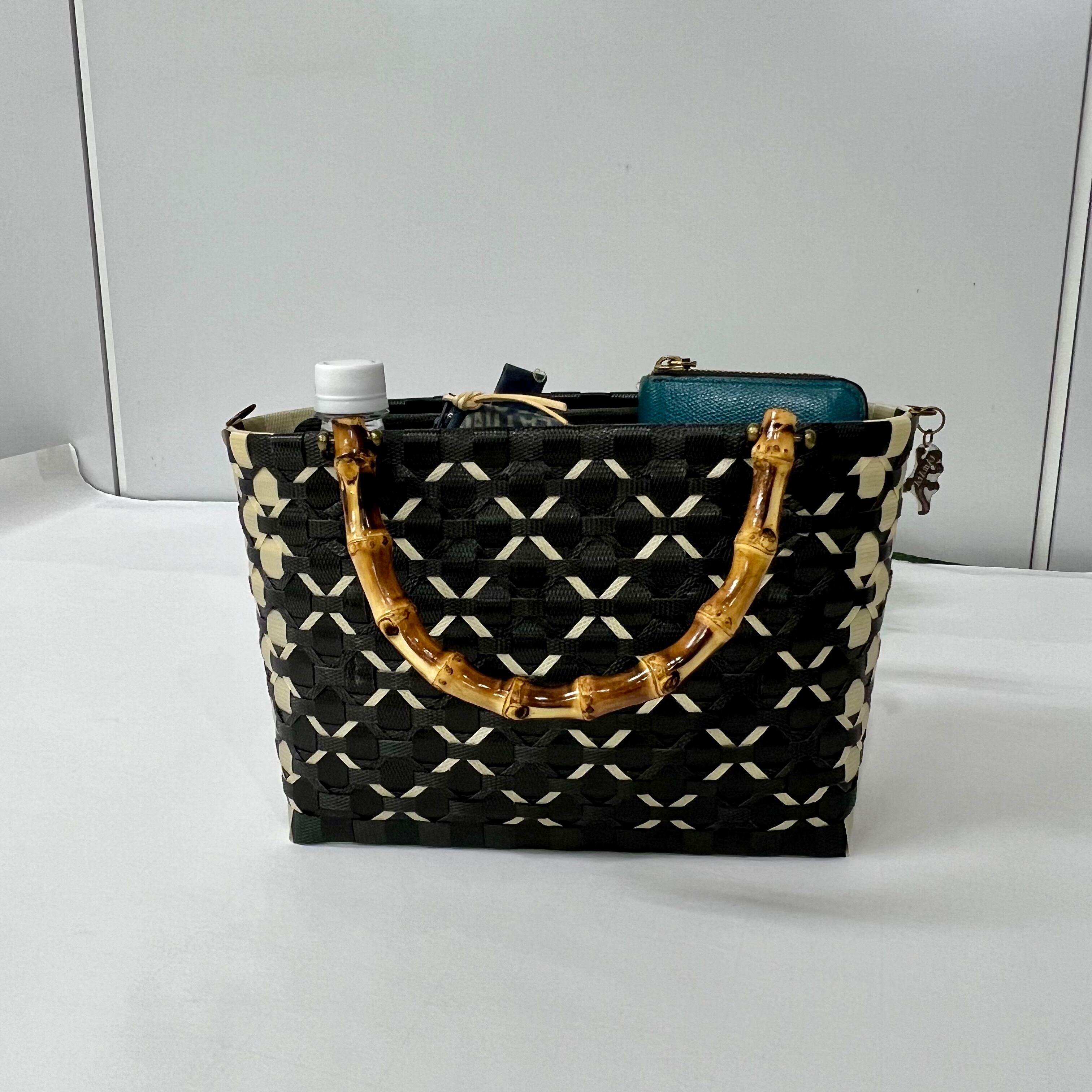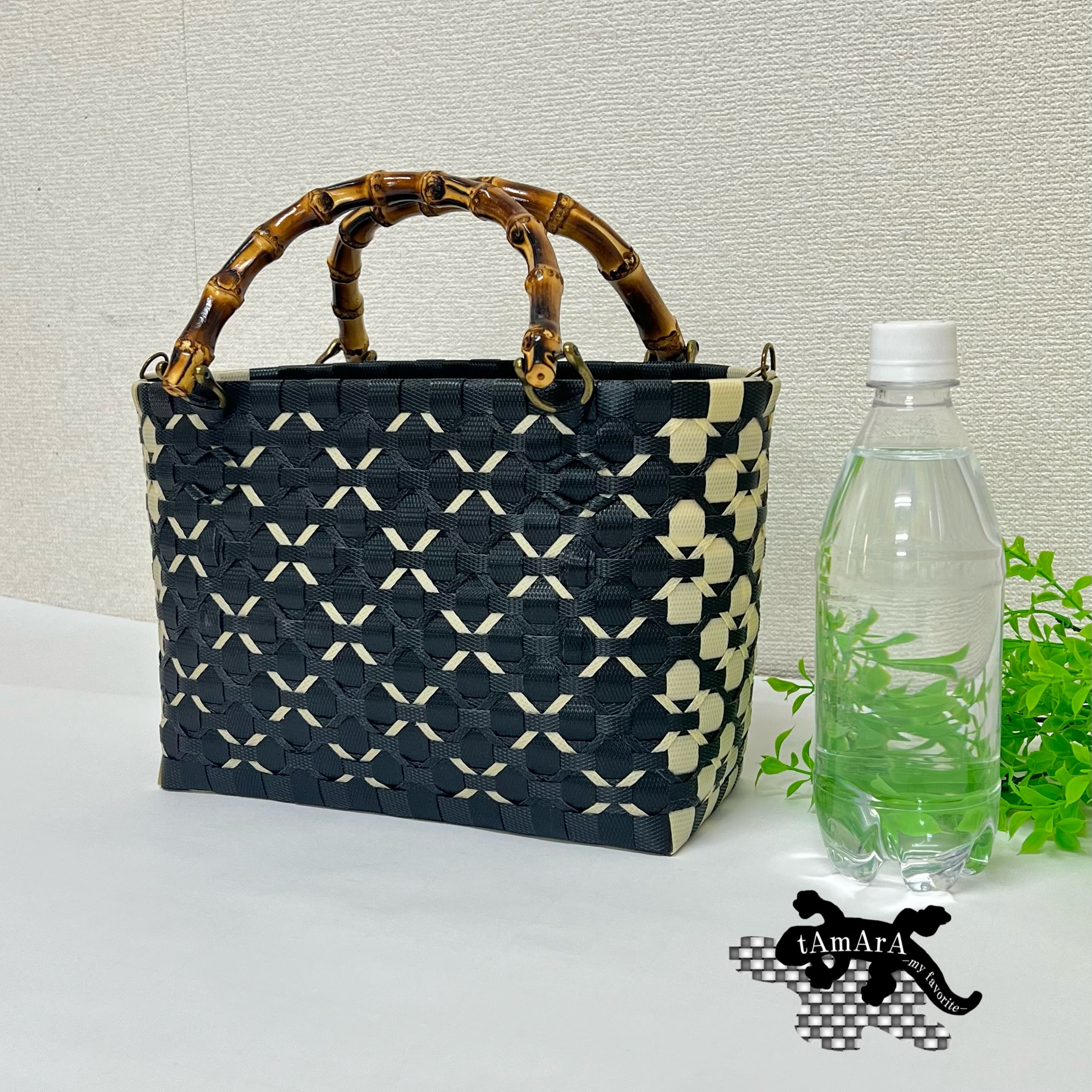 日本製梱包用PPバンドで編み上げたプラカゴバッグです。