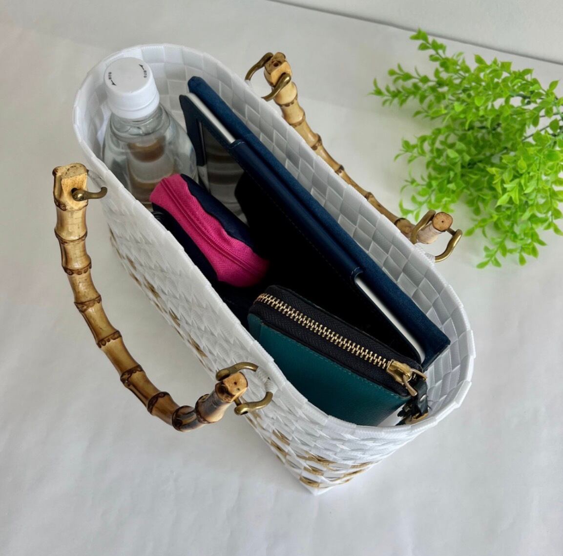 【受注制作】プラカゴ Sサイズ/B5 S-321 白*ブラウン 2way バンブーハンドル プラカゴバッグ 雨の日バッグ