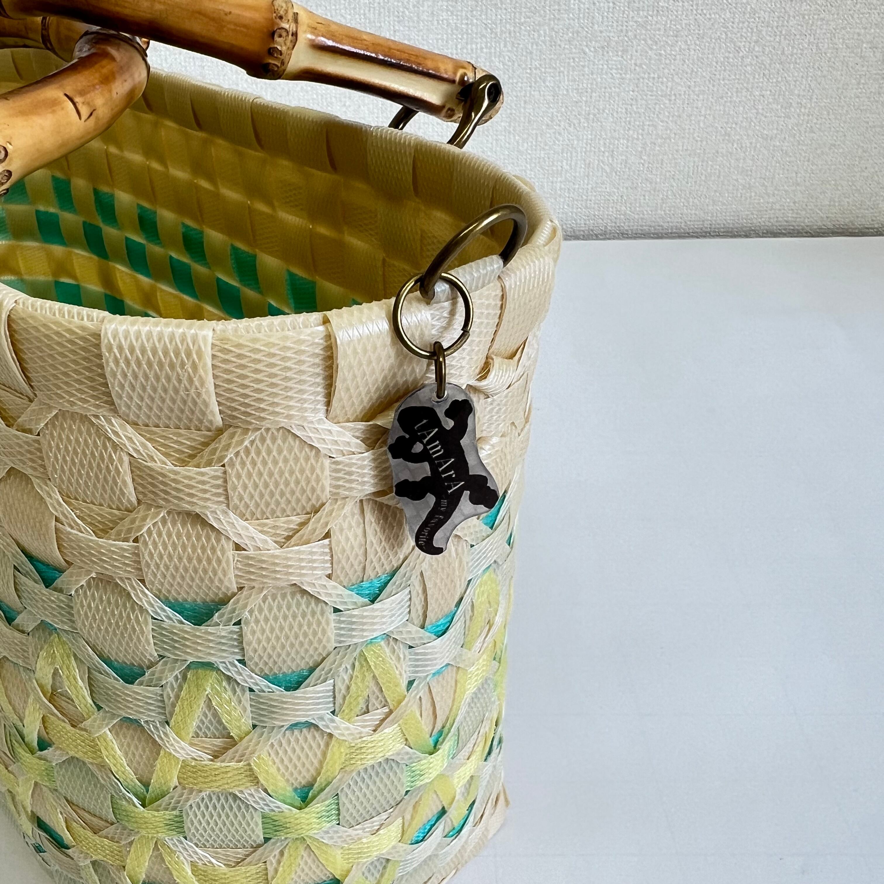 透明緑の上に黄色いバンドを重ねた、ミモザの季節限定(3月・4月)の春色カゴバッグです。