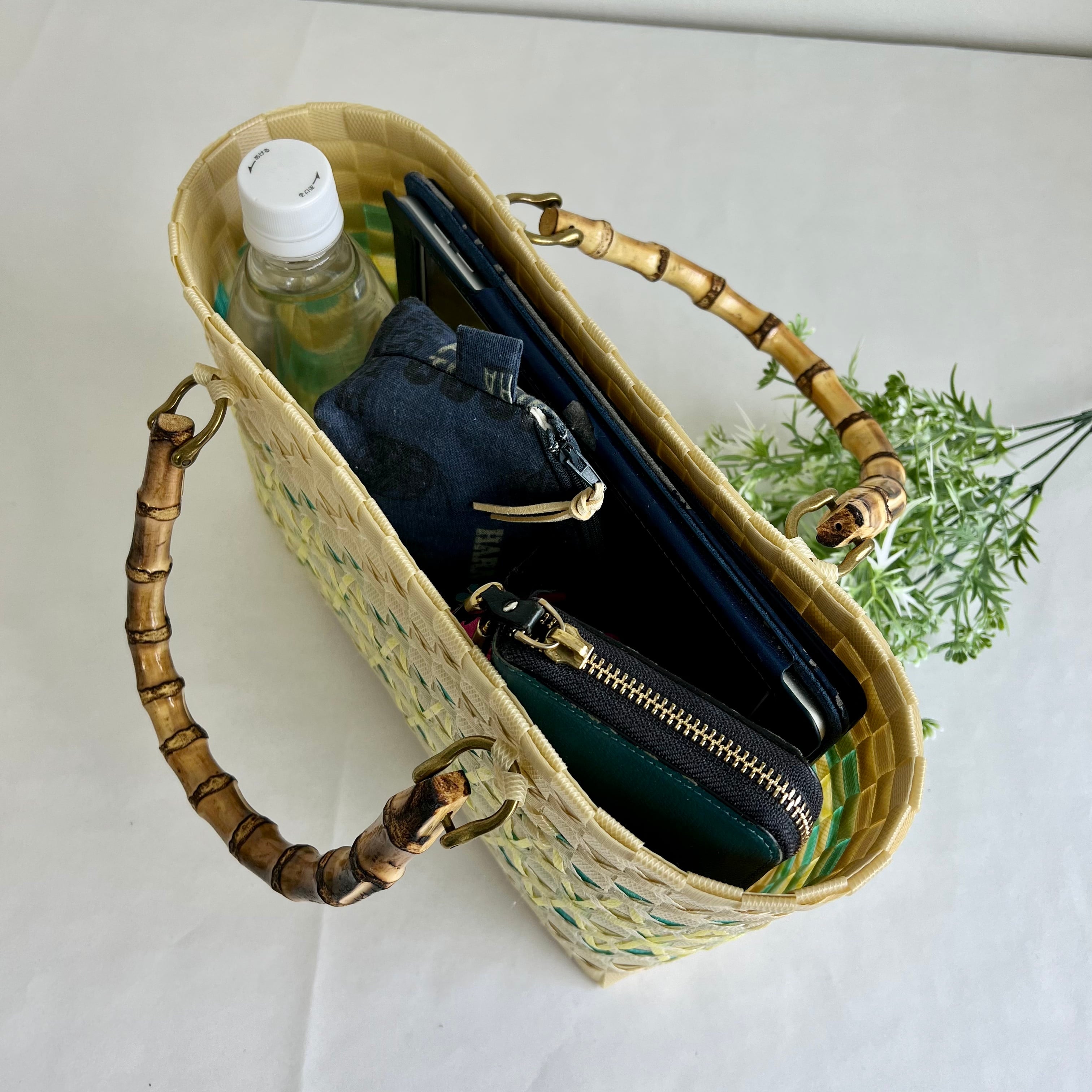 季節限定ミモザカラーのカゴバッグ プラカゴ Sサイズ/B5 S-392 ベージュ*透明緑*透明黄 2wayバンブーハンドル かごバッグ 雨の日バッグ PPバンド