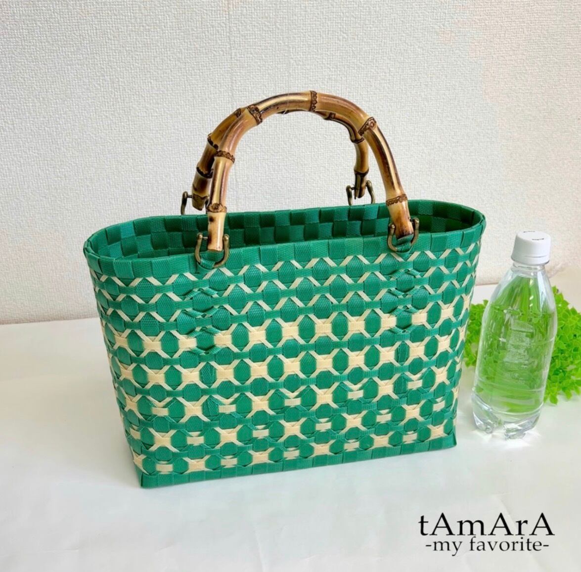 【受注製作】プラカゴ Mサイズ/A4 M-402 深緑*ベージュ 2way バンブーハンドル プラカゴバッグ 雨の日バッグ